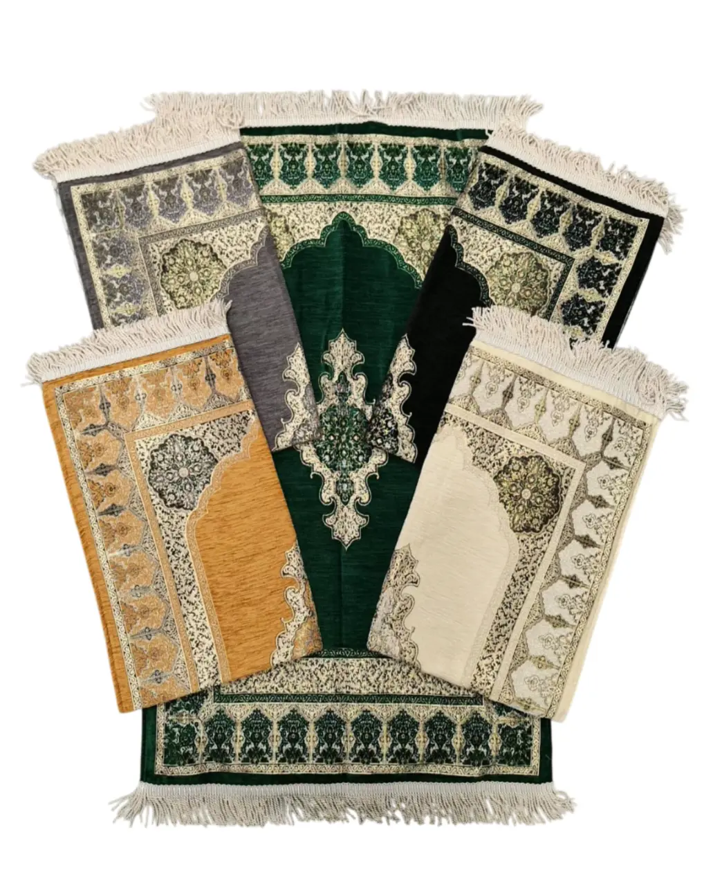 Den silkebløde overflade giver en behagelig og støttende fornemmelse under sujood, mens tæppets fine struktur og dybe farver udstråler værdighed, varme og åndelig balance. Hvert tæppe er designet med respekt for den islamiske tradition og bringer en følelse af fred og fokus til dine daglige bønner.
