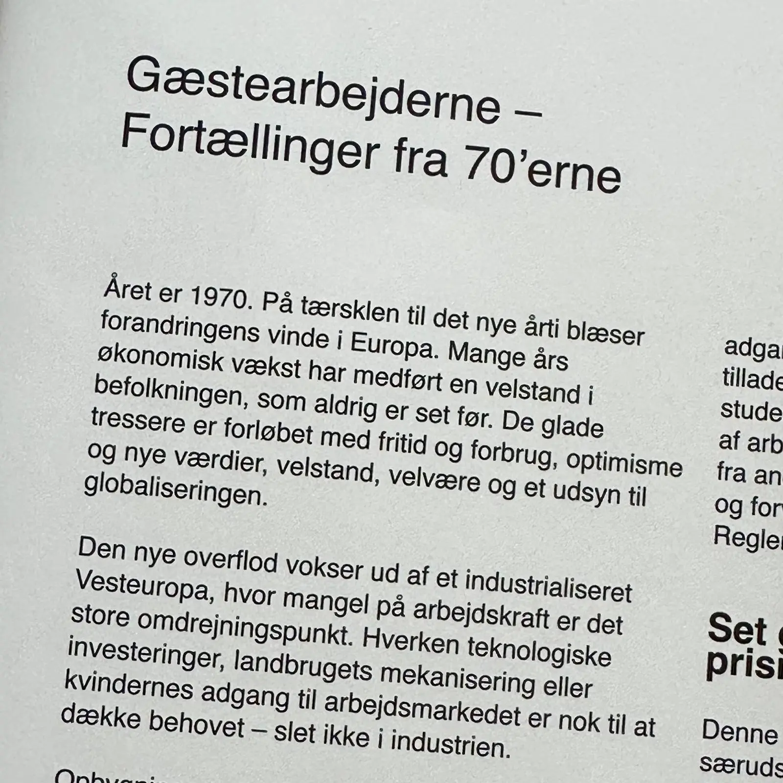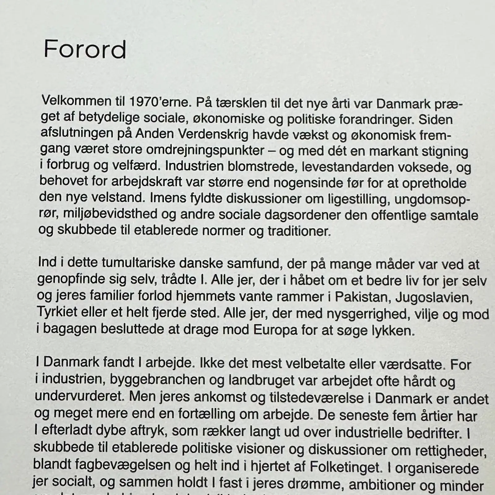 Udstillingskatalog, der i tekst og billeder fortæller personlige historier om mange af de mennesker, der i 1970'erne kom til Danmark fra blandt andet Pakistan, Jugoslavien og Tyrkiet for at indtage en plads på det danske arbejdsmarked og i det danske samfund.