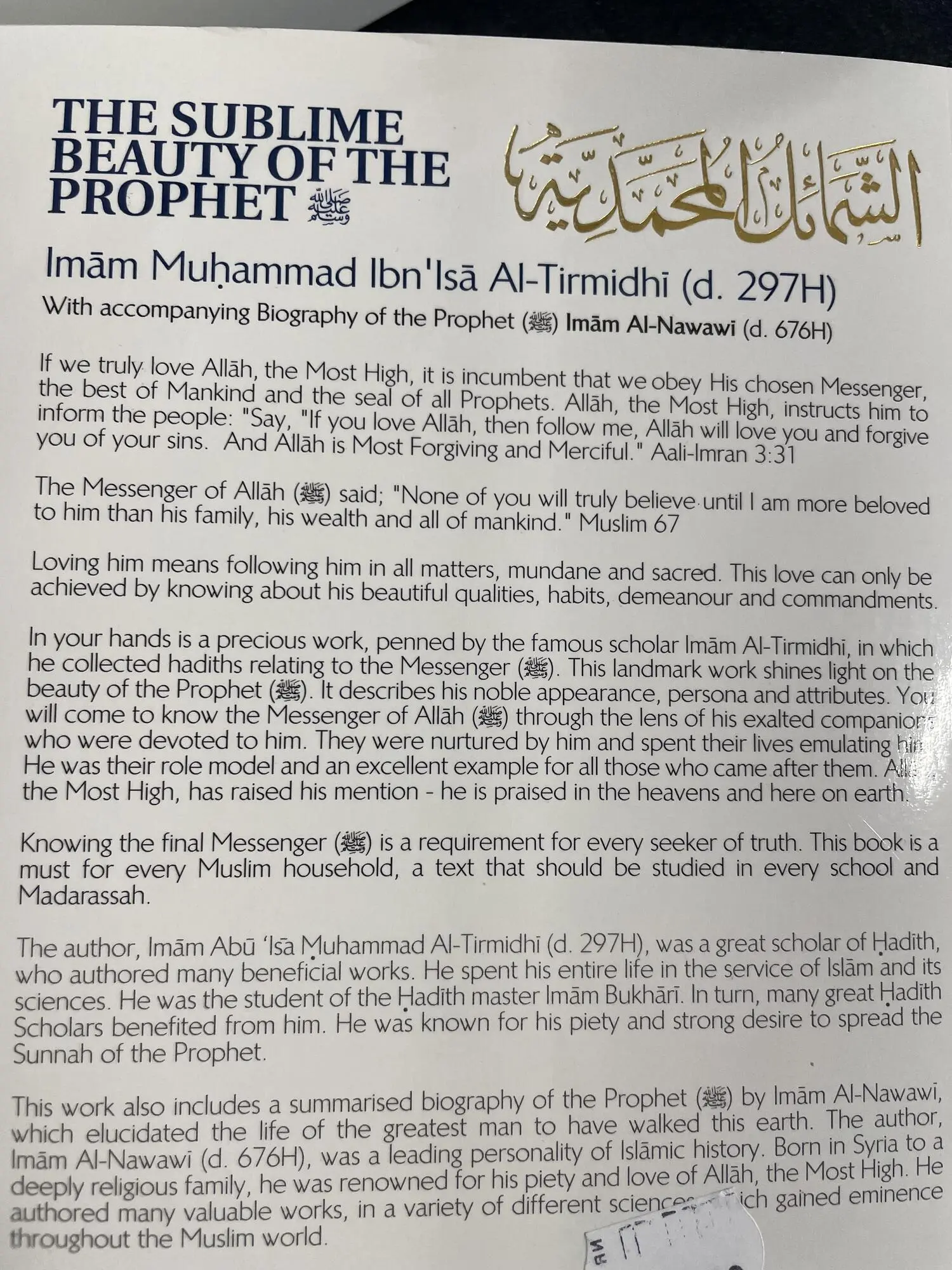 This precious work, penned by the famous scholar Imam at-Tirmidhi, in which he collected hadiths relating to the Messenger (peace and blessing be upon him). This landmark work shines light on the beauty of the Prophet (peace and blessing be upon him). It describes his noble appearance, persona and attributes. You will come to know the Messenger of Allah (peace and blessing be upon him) through the lens of his exalted companions who were devoted to him. They were nurtured by him and spent their lives emulating him. He was their role model and an excellent example for all those who came after them. Allah, the most High, has raised his mention - he is praised in the heavens and here on earth.
