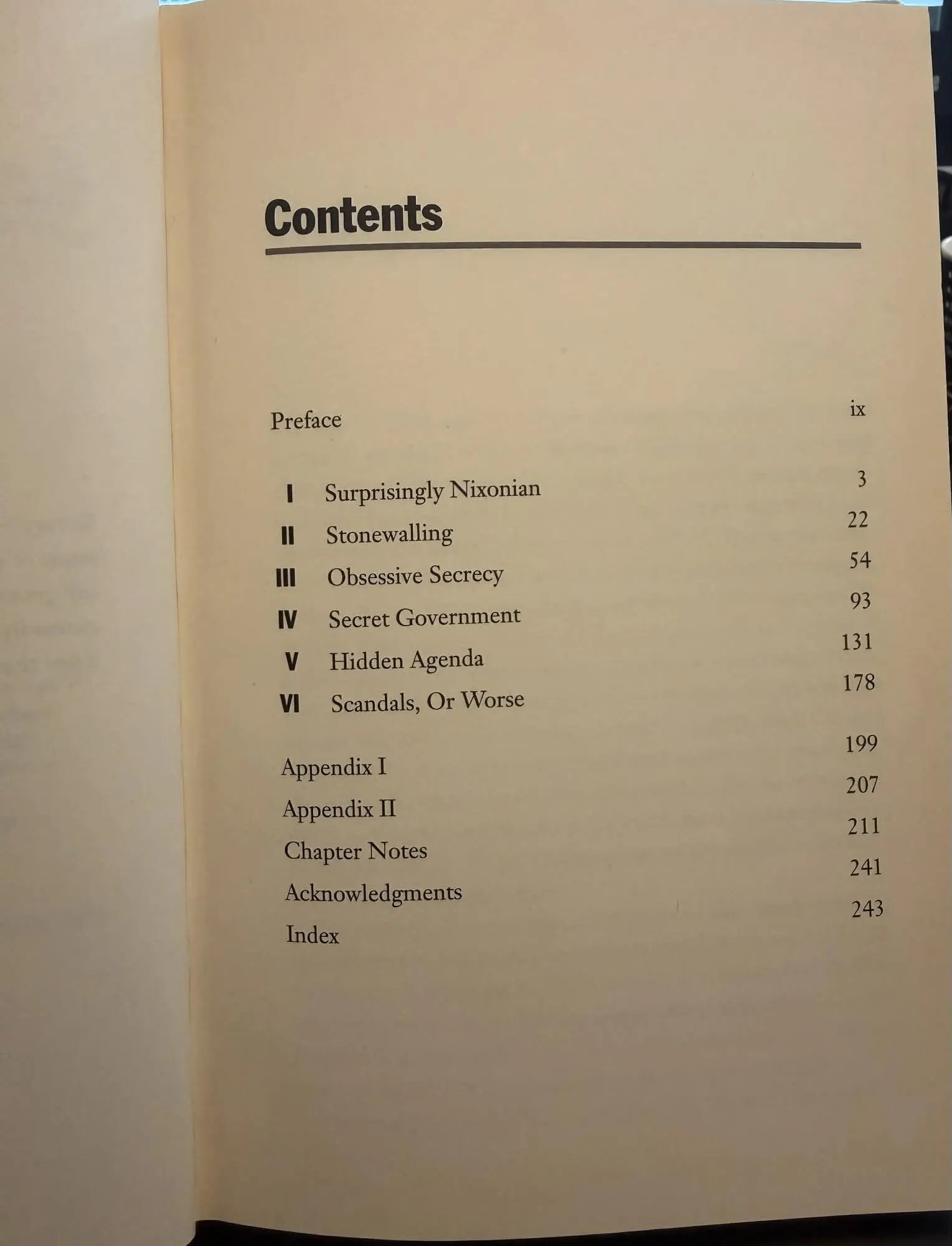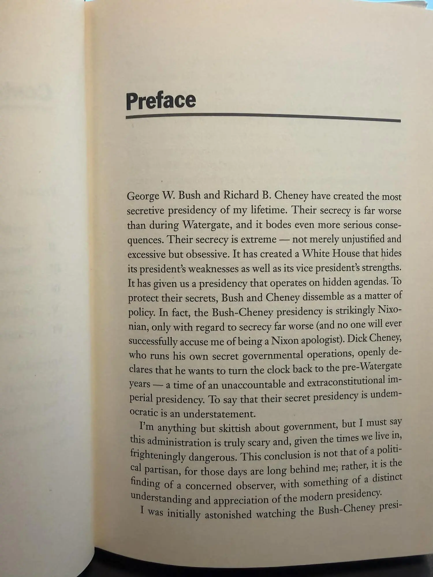 In the book, Dean criticizes the administration of President George W. Bush for lacking transparency in decision making and compares it with the administration of President Richard Nixon, for whom he served as legal counsel. He also draws attention to potentially serious issues that, as of 2004, had been given a low profile in the US media. In particular, he notes that the 18 March 2003 presidential determination, a condition of the legislation which authorized the 2003 invasion of Iraq, failed to satisfy the terms imposed by Congress and consequently would justify impeachment.