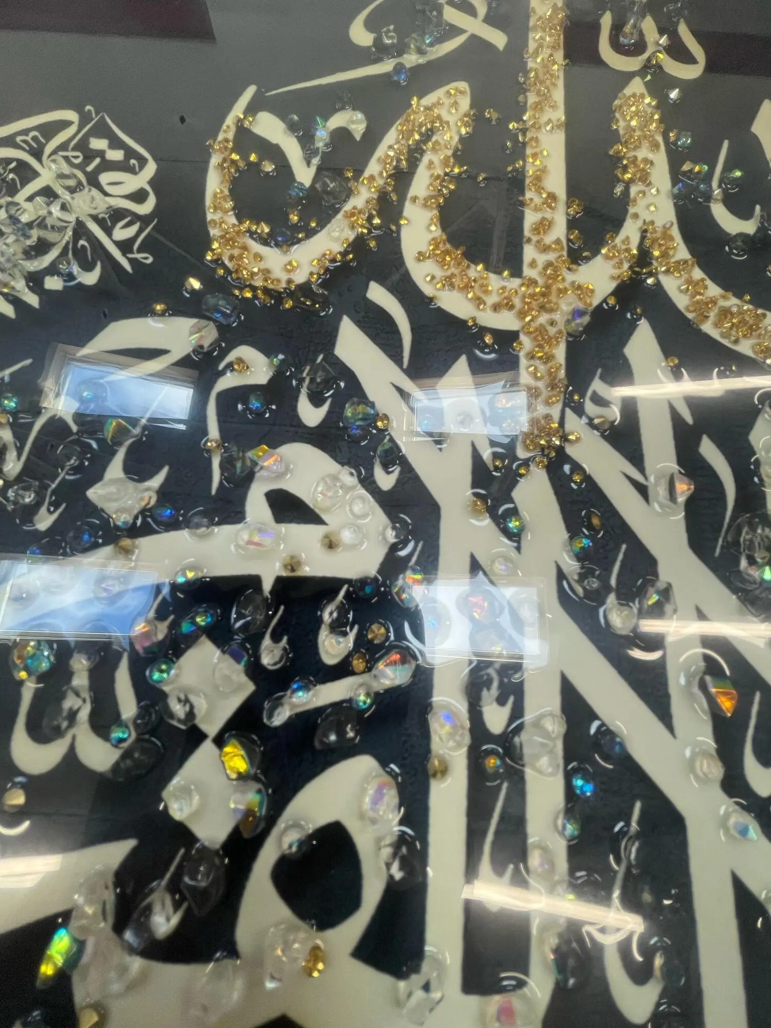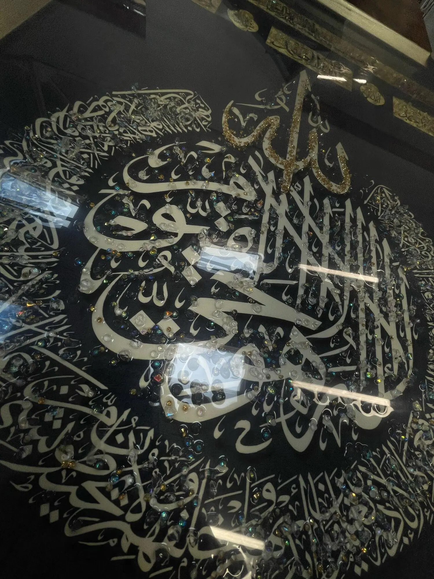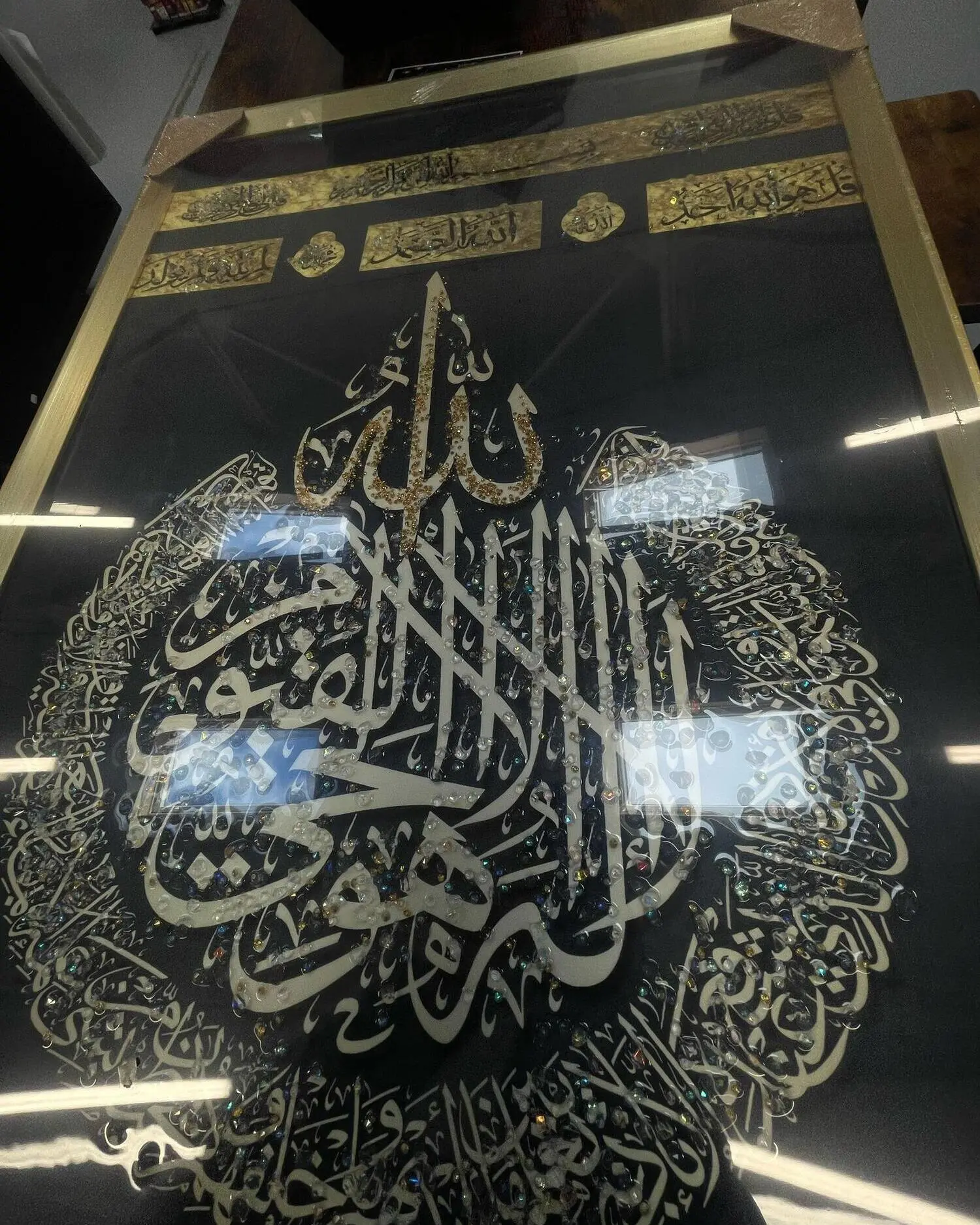 Smuk kalligraf med Ayetel Kursi i guld med smukke små sten.