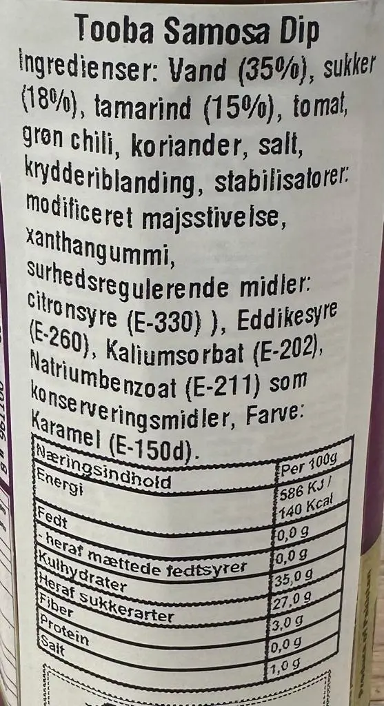 Tooba samosa dip sauce har en tyk konsistens og en kompleks smag. Den er krydret og har en blanding af søde, sure og krydrede smagsnuancer.