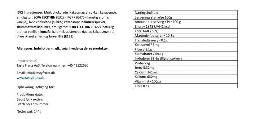 Mørk chokolade (kakaomasse sukker kakaosmør, emulgator: SOJA LECITHIN (E322). PGPR(E476), kunstig aroma: vanilje), hvid chokolade sukker kakaosmør, helmælkspulver, skummetmælkspulver, emulgator: SOJA LECITHIN (E322), naturlig aroma: vanilje), kunafa, karamel. udstenede dadler. kakaosmør. ren ghee (klaret smør) og farve: Blå (E133).