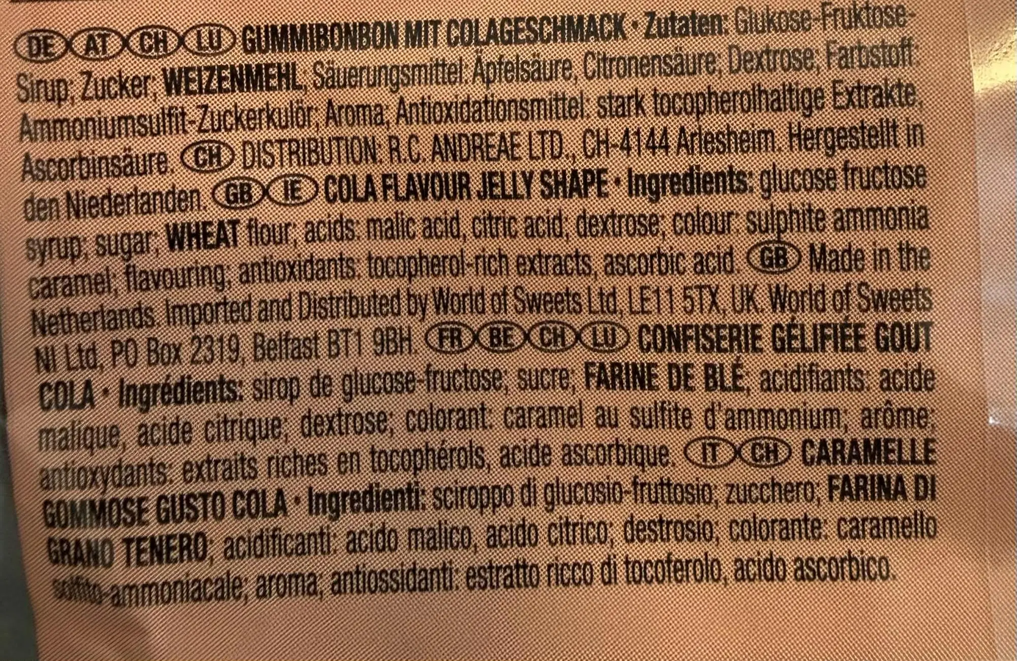 Glukose-fruktosesirup, sukker, hvedemel, syrningsmidler (æblesyre, citronsyre), dextose, farve (ammoniumsulfit, sukkerkulør), antioxidanter (tocopherolrige ekstrakter).