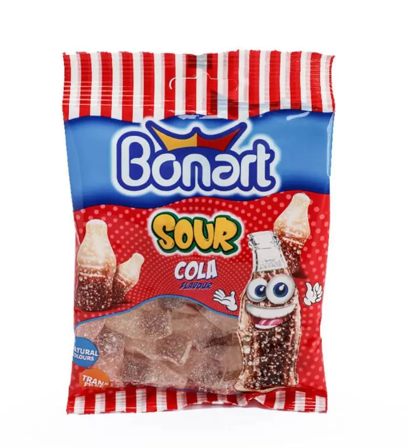 Bonart Sour Cola er tyggevenlige vingummier med klassisk colasmag og en syrlig sukkerbelægning, der giver en forfriskende og boblende smagsoplevelse.