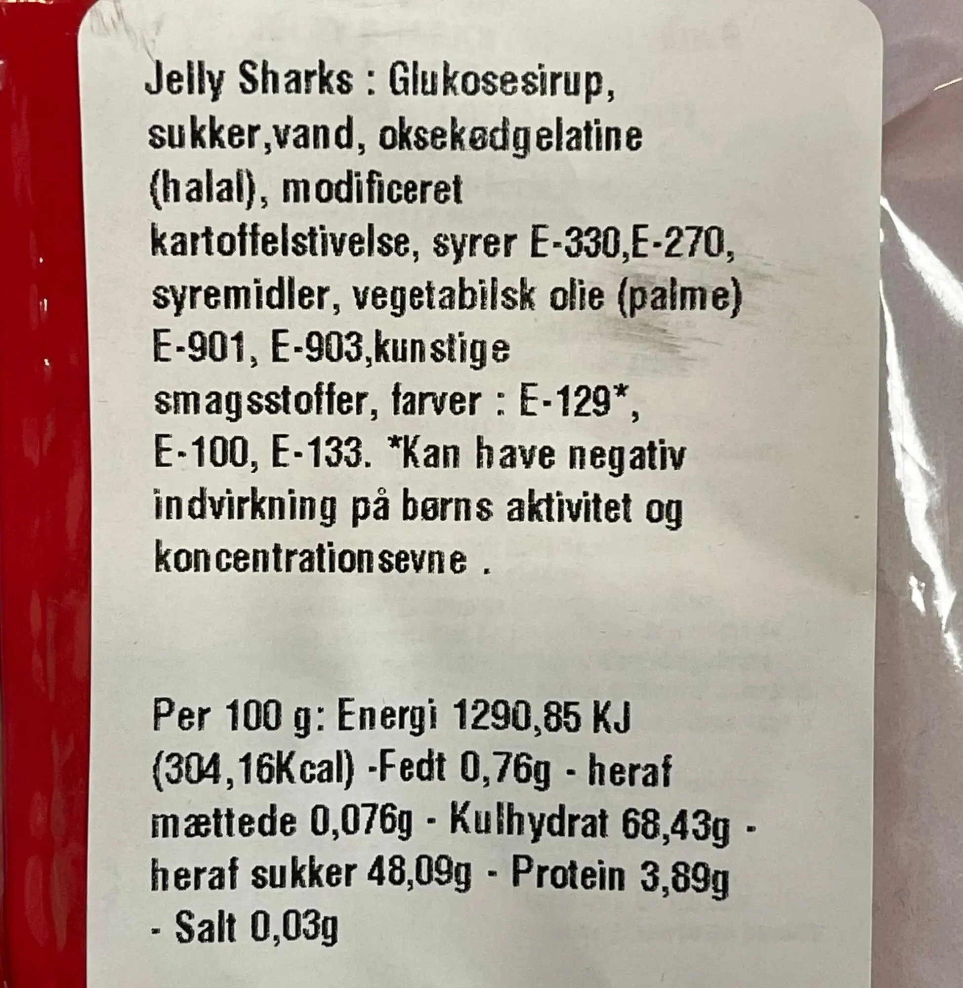 Glukosesirup, sukker, vand, oksekødgelatine (halal), modificeret kartoffelstivelse, surhedsregulerendemidler: E-330,E-270, belægningsmidler: vegetabilsk olie (palme) E-901, E-903. Kunstige smagsstoffer, farver: E-129*, E-100, E-133.