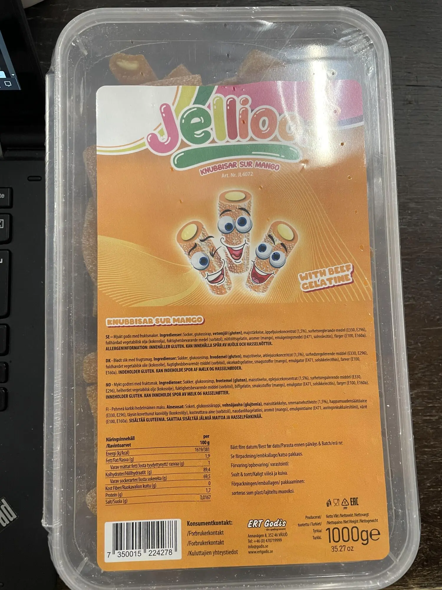 Sukker, glukosesirup, hvedemel (gluten), majsstivelse, æblejuicekoncentrat (1,5%), surhedsregulerende middel (E330, E296), fuldt hydrogeneret vegetabilsk olie (kokosolie), fugtighedsbevarende middel (sorbitol), oksekødsgelatine, smagsstoffer (mango), emulgator (E471), solsikkelecitahin (E1601), farvestof (E100hin). Indeholder gluten. Kan indeholde spor af mælk og hasselnødder.