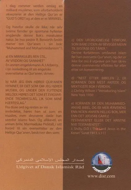 Og hvorfor skulle de ikke, bår selv svorne fiender gir spontane hyllester angående denne Bok's mirakuløse natur. Se hva pastor R. Bosvorth-Smith mener om Qur'anen i sin bok: "Muhammed and Mohammedanism" 1: