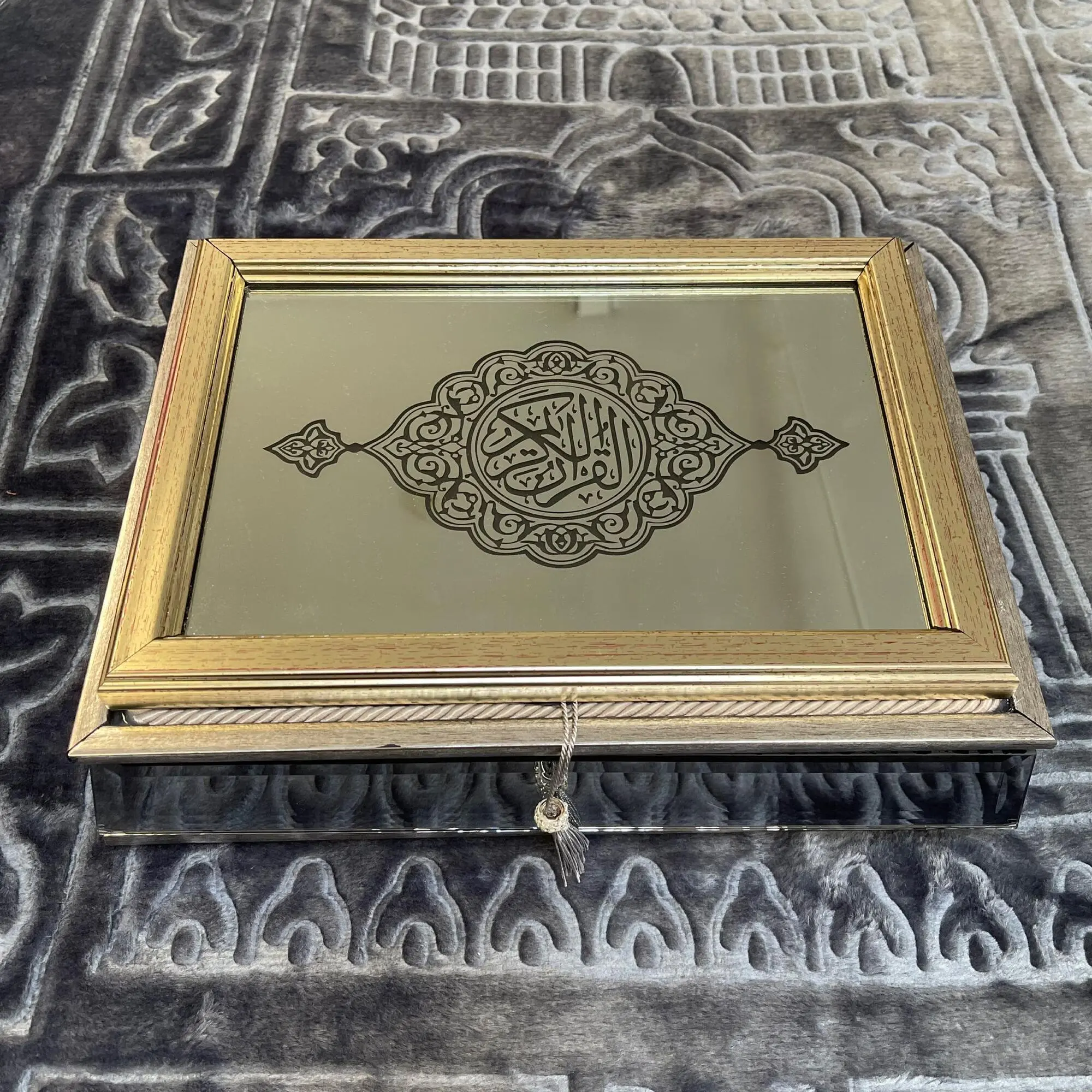 Smuk glas boks med glas kant og med koran og tasbih