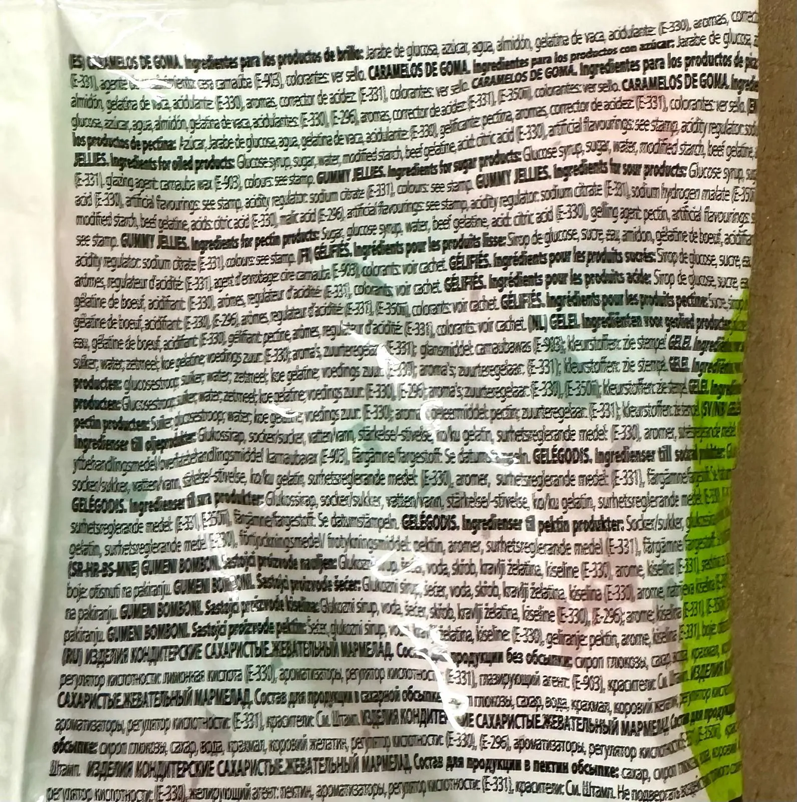 Glukosesirup, vand, sukker, majsstivelse, gelatine, syrningsmiddel: citronsyre, vegetabilsk olie (indeholder palme og/eller kokos), coatingmiddel: carnaubavoks, smagsstoffer, surhedsregulerende middel: natriumcitrat, farvestoffer: E102, E129, E133, E171 .