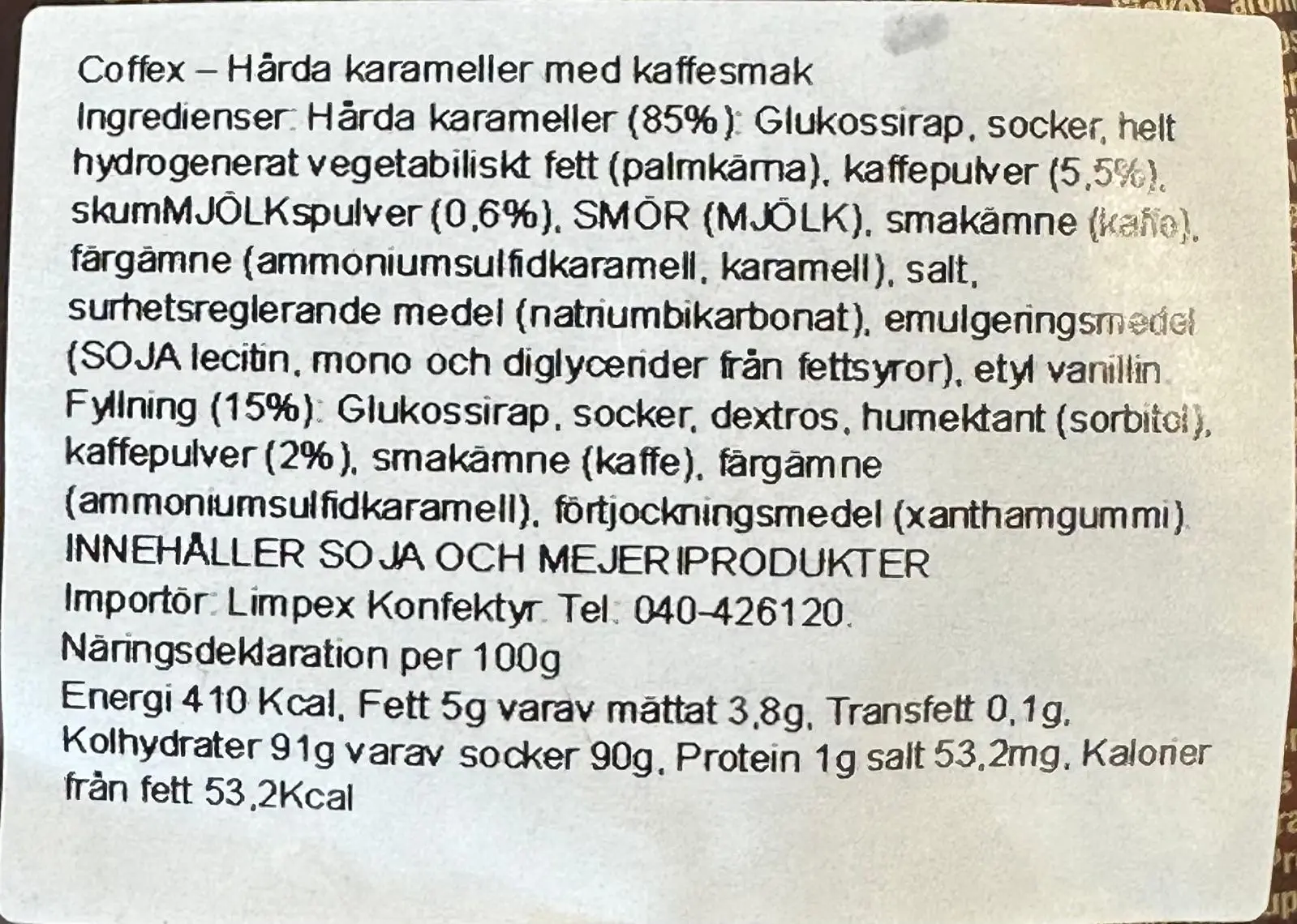 Hårde karameller (85%): Glukosesirup, sukker, fuldt hærdet vegetabilsk fedt (palmekerne), kaffepulver (5,5%): skummetmælkspulver (0,6%), smør (mælk), aroma (kaffe), farvestof (ammoniumsulfidkaramel, karamel), salt, surhedsregulerende middel (natriumbicarbonat), emulgator (sojalecithin, mono- og diglycerider fra fedtsyrer), ethylvanillin. Fyld (15 %): Glukosesirup, sukker, dextrose, fugtighedsbevarende middel (sorbitol), kaffepulver (2 %), aroma (kaffe), farvestof (ammoniumsulfidkaramel), fortykningsmiddel (xanthamgummi).