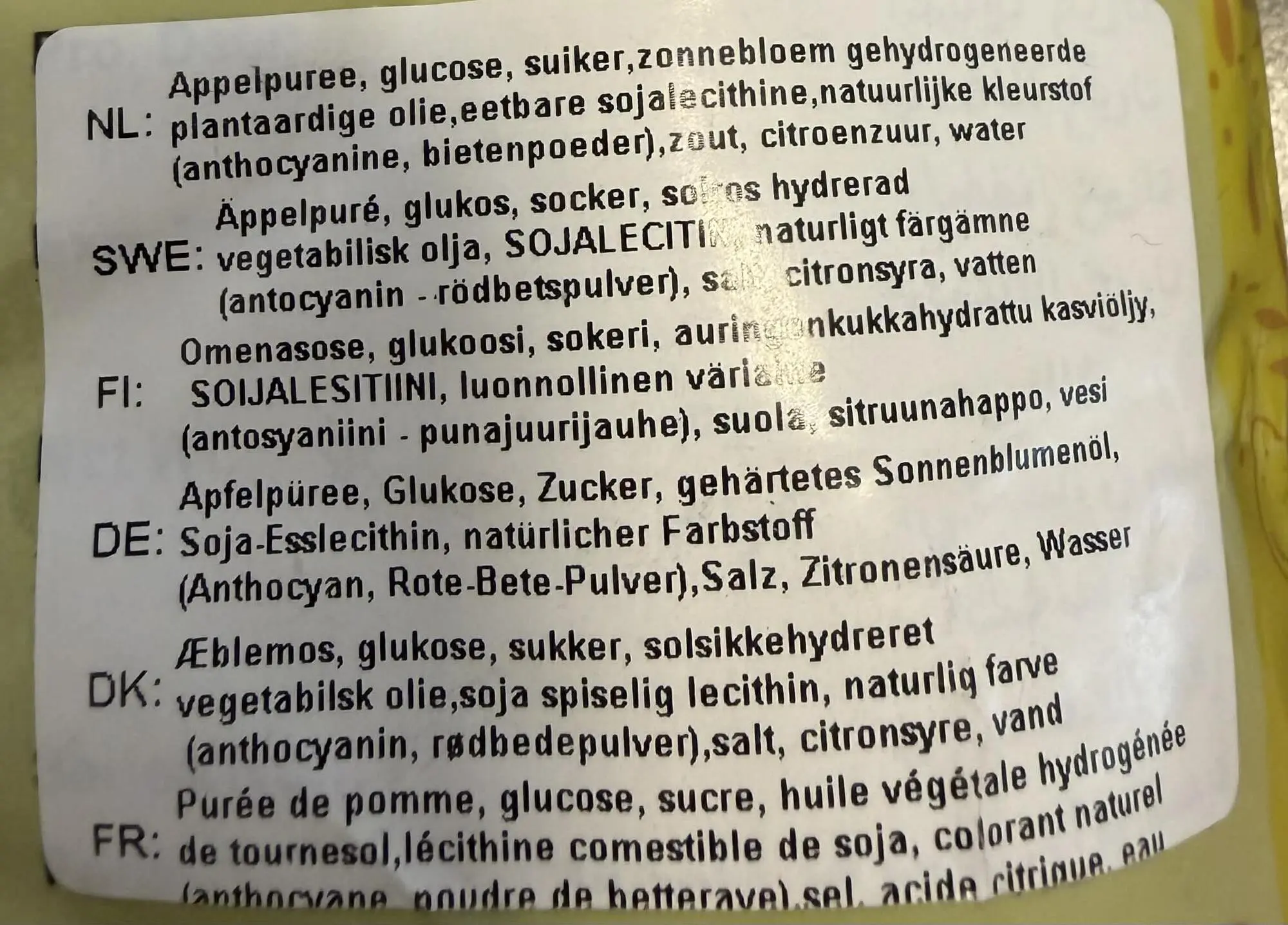Æblemos, glukose,  solsikkehydret vegetabilsk olie, spiselig lecithin, naturlig farve (anthocyanin, rødbedepulver), salt, citronsyre, vand.