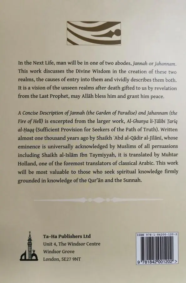 A Concise Description of Jannah /the Garden of Paradise) and jahannam /the Fire of Hell) is excerpted from the larger work, Al-Ghunya Li-Talibi Tariq al-Haqq (sufficient Provision for Seekers of the Path of Truth). Written almost one thousand years ago by Shaikh 'Abd al-Qadir al-Jilani, whose eminence is universally acknowledged by Muslims of all persuasions including Shaikh al-Islam Ibn Taymiyyah, it is translated by Muhtar Holland, one of the foremost translators of classical Arabic. This work will be most valuable to those who seek spiritual knowledge firmly grounded in knowledge of the Qur'an and the Sunnah.