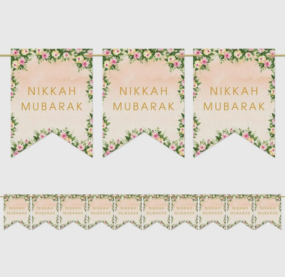 Vores nye 'Nikkah Mubarak' banner er trykt på begge sider og leveres med 3 meter satinbånd. Bring varme og glæde til dit hjem og dit bryllupssted med denne stilfulde pakke genanvendelige, dobbeltsidede festbanner.