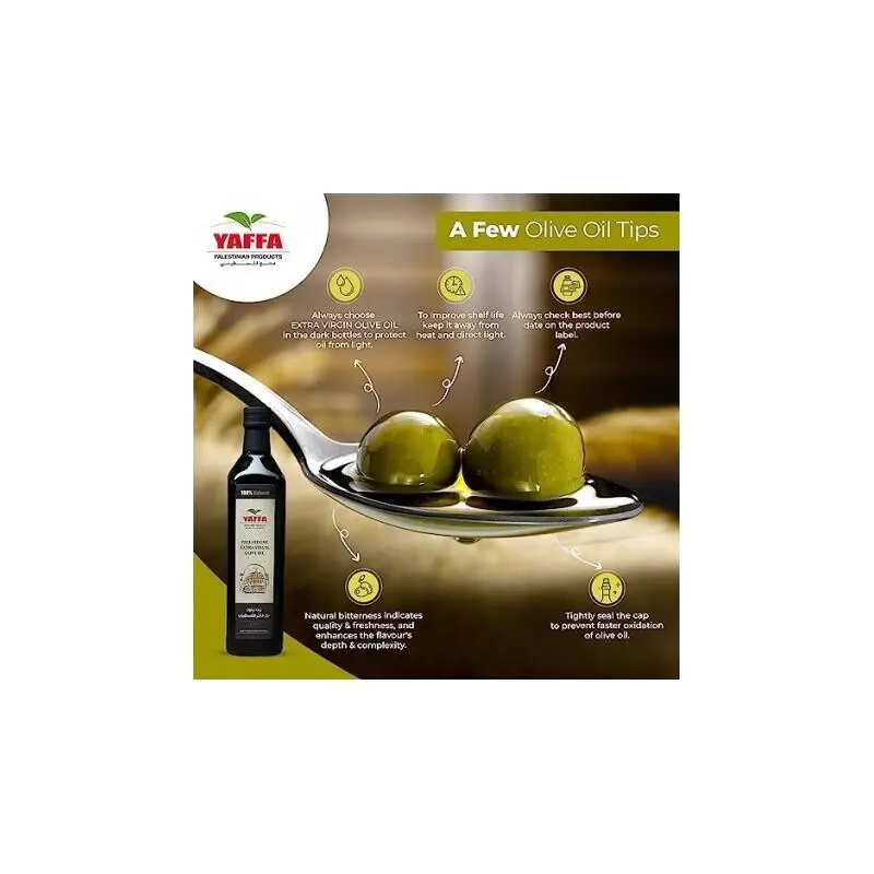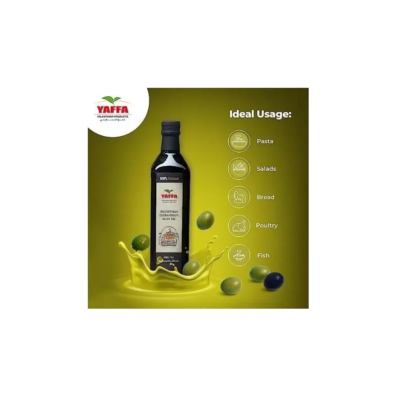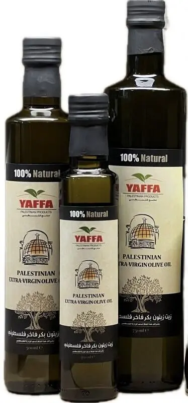 Yaffa Olivenolie er en førsteklasses olivenolie fremstillet af nøje udvalgte oliven dyrket i Palæstina. Olien er produceret efter traditionelle metoder og koldpresset for at bevare sin naturlige smag, aroma og kvalitet.