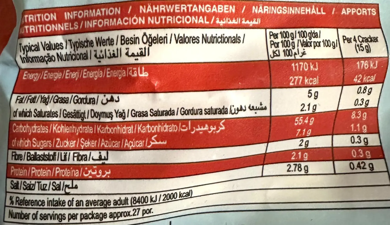 Hvedemel, palmeolie, glukosesirup, salt (2,6%), hævemidler (natriumcarbonater, ammoniumcarbonater), aroma, konserveringsmiddel (natriummetabisulfit).