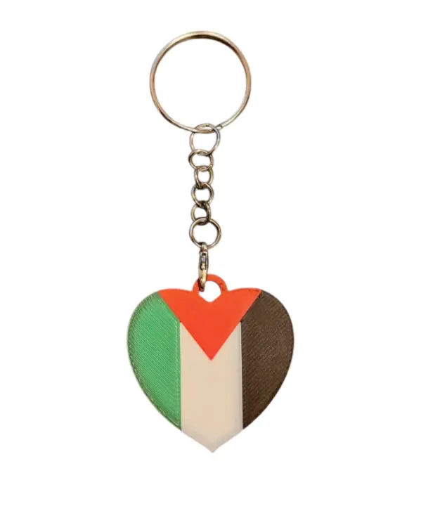Bær et stærkt symbol tæt på dig med denne smukke Palæstina-nøglering, formet som et hjerte og dekoreret i de ikoniske farver fra det palæstinensiske flag.