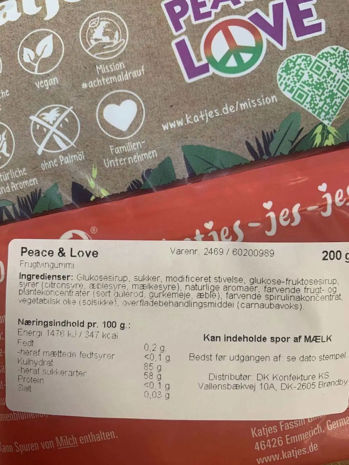 Sukker, glukose-sirup, modifiseret stivelse, glukose-fruktosesirup, syre (æblesyre, citronsyre, mælkesyre), naturlige aromaer, farvende frugt- og plantekoncentrater (sort gulerod, gurkemeje, æble), farvende spirulinakoncentrat, vegetabilske plie (solsikke), overfladebehandlingsmiddel (carnaubavoks).