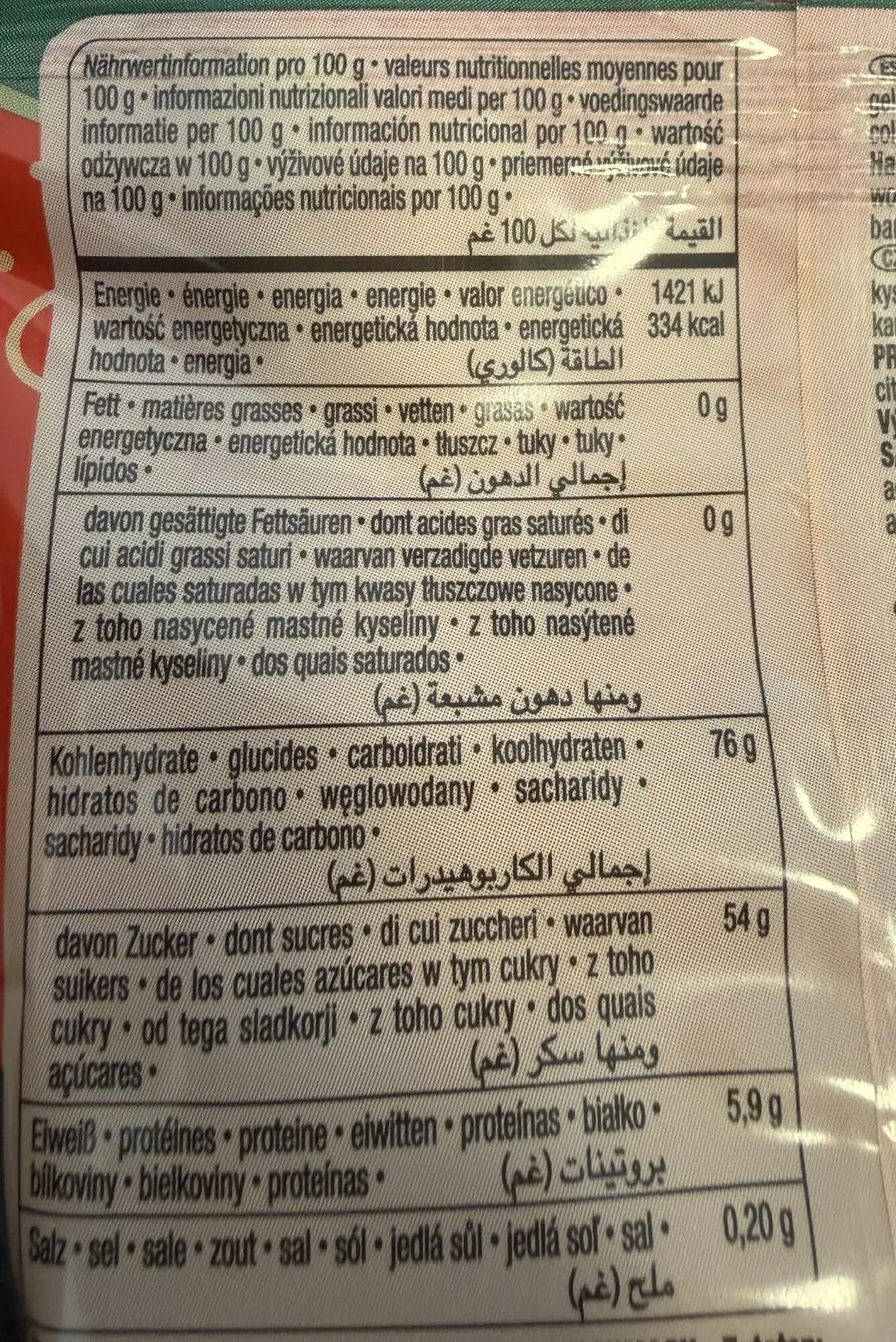 - Heraf sukkerarter 54 g