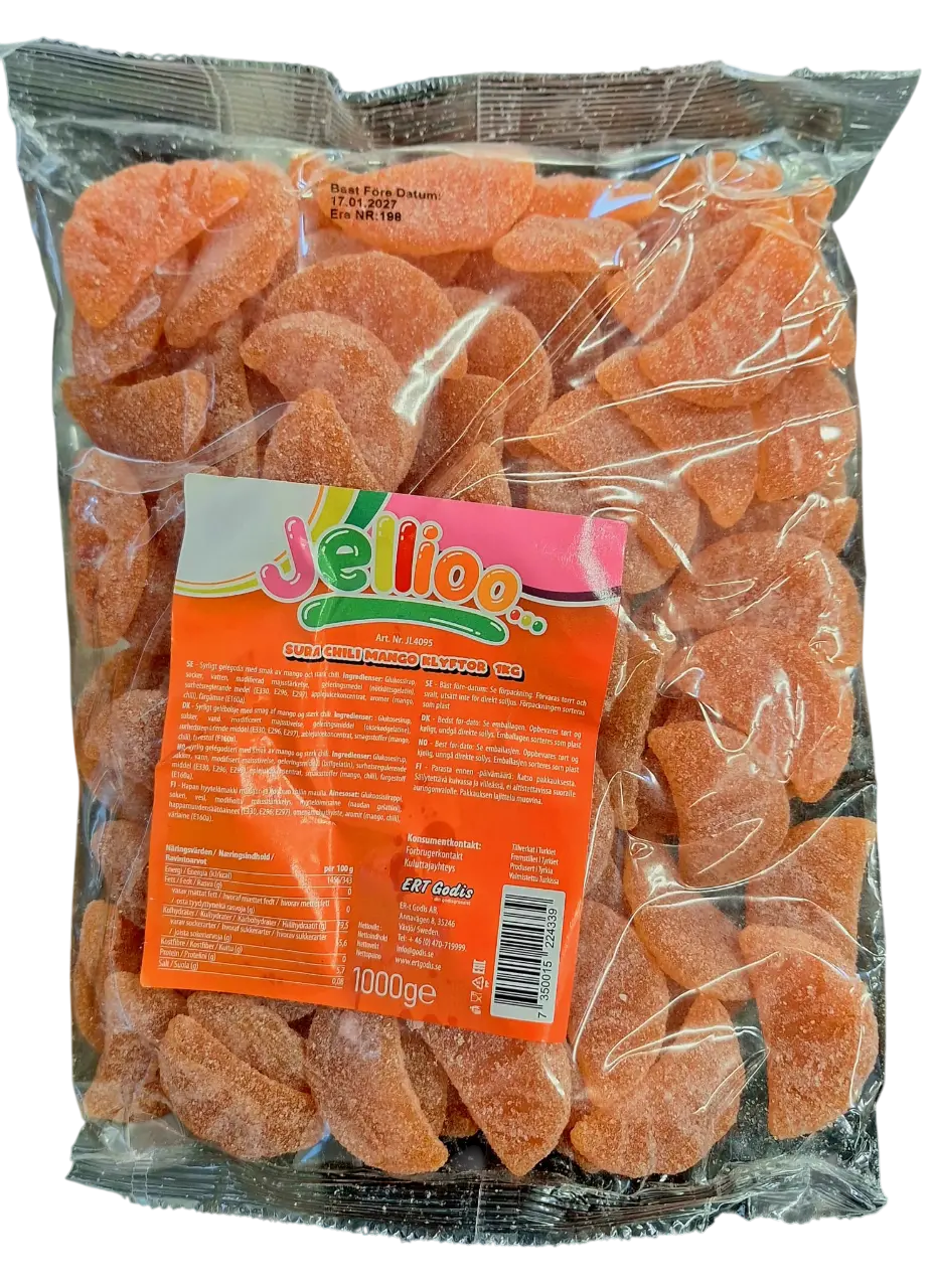 Glukosesirup, sukker, modificeret majsstivelse, geleringsmiddel (oksegelatine), surhedsregulerende midler (E330, E296, E297), æblejuicekoncentrat, aromaer (mango, chili), farvestof (E160a).